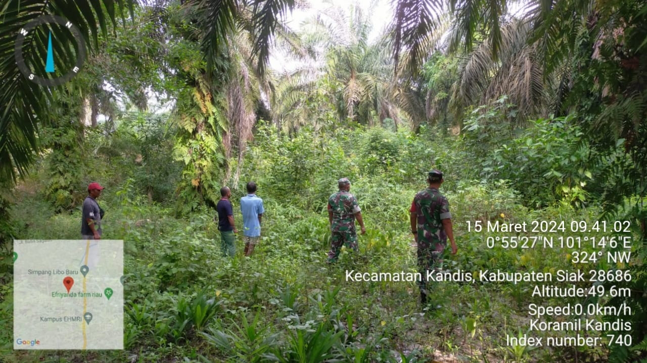 Babinsa Koramil 05/Pwk Kandis Kodim 0322/Siak Pelda Adi Eko S dan Sertu Suriyadi bersama tiga orang warga melakukan kegiatan patroli Karhutla disejumlah lahan masyarakat yang dianggap rawan terbakar diwilayah Kelurahan Telaga Sam Sam Kecamatan Kandis Kabupaten Siak, Riau. Jumat, 15 Maret 2024.